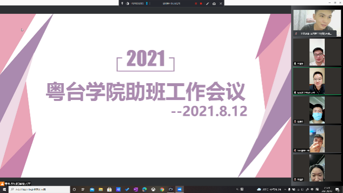 2021年8月12日,太阳城集团根据公司疫情防控要求,组织2021级助理班主任召开线上培训工作会议,为下一步的助班迎新服务工作做好准备。