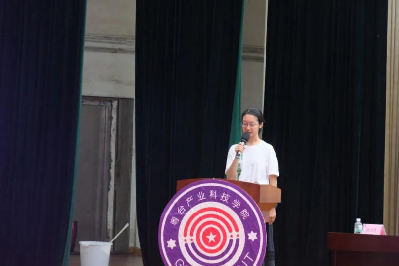 仪式第六项,新生代表2024级经济与金融1班的邓子菲同学发言,她代表全体新生向师长和亲友表示真挚的感谢,并表示将在四年老员工活中,学而知不足,学以致用,开拓创新,抓紧机遇,迎接挑战。