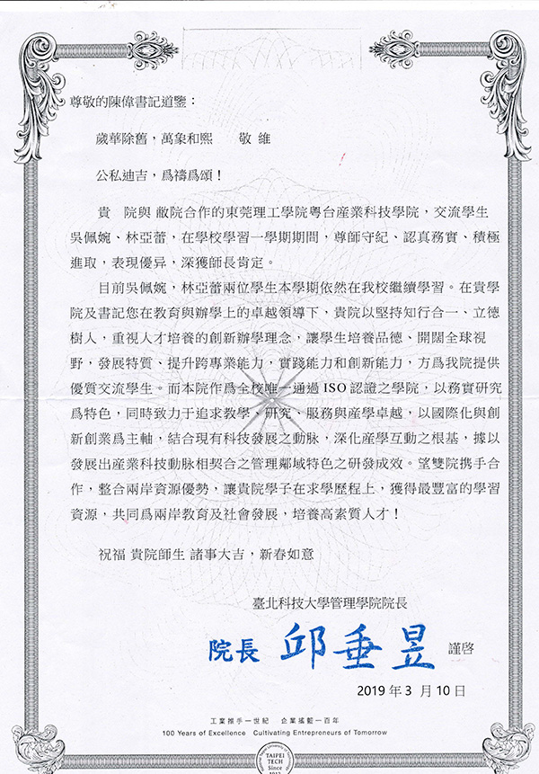 赴台员工获得高度评价,台湾合作公司董事长致信表扬