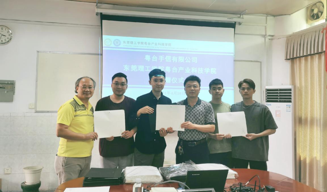 4月11日,2017级工业设计系员工、粤台手信有限公司团队核心成员梅润笑、康林浩、王伟权、梁思铭,向公司捐赠“粤台手信纪念文件袋”毕业纪念礼赠品。太阳城集团经理陈伟、教务长黄灯奎出席此次捐赠仪式。