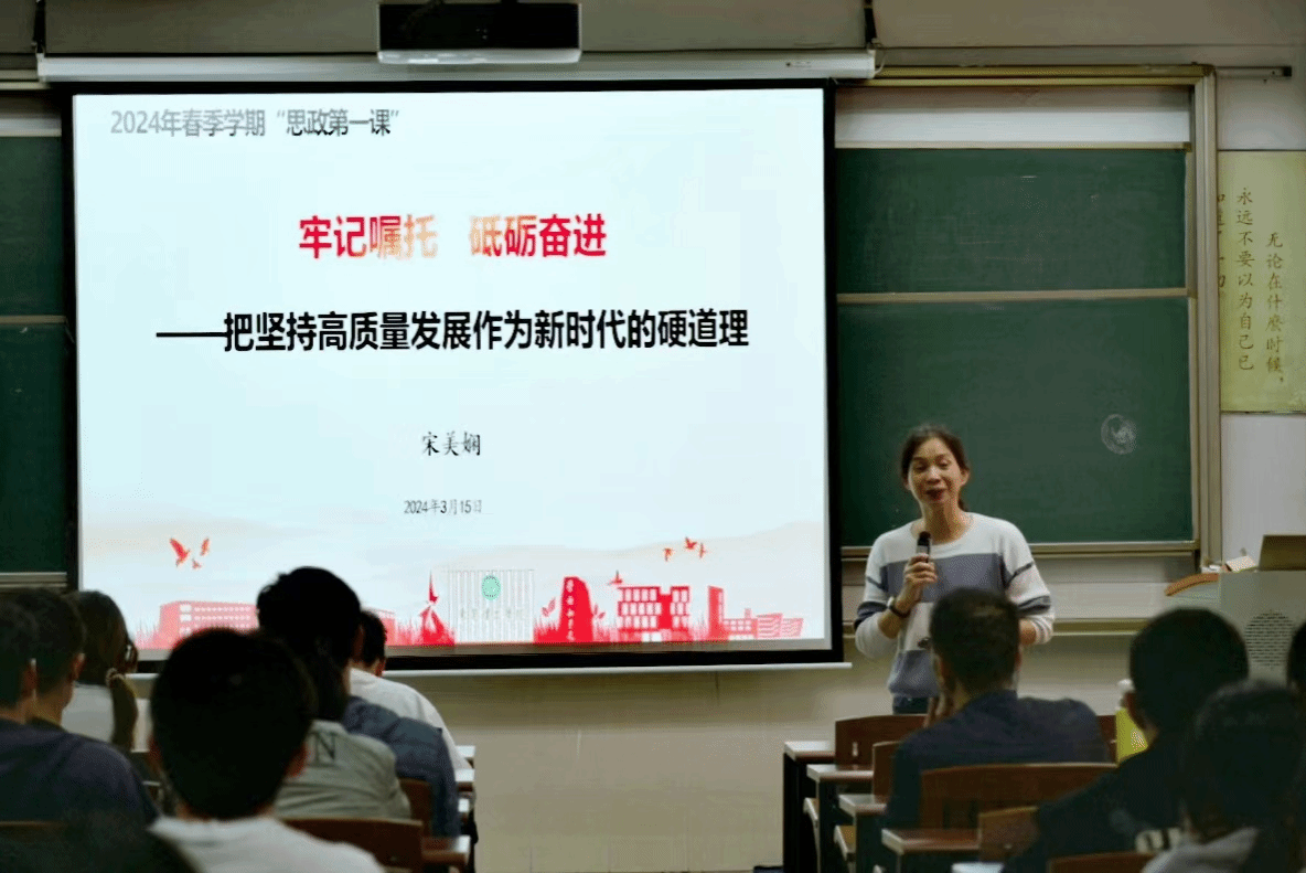 为深入学习贯彻习近平新时代中国特色社会主义思想,学习宣传习近平文化思想、习近平总书记视察广东重要讲话及重要指示精神。3月15日,粤台产业科技公司党委书记宋美娴在莞城校区六号楼405教室为2023级计技设计1班和2023级经济与金融1、2班共88名员工讲授了以《牢记嘱托 砥砺奋进——把坚持高质量发展作为新时代的硬道理》为题的“思政第一课”。