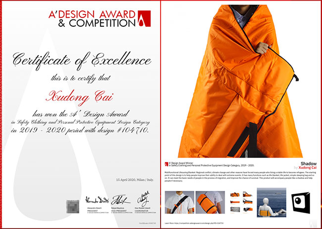 作品“Shadow”是一件多功能应急救援产品。它能够通过简单的扩展与变换形态后,拥有浮力助具、救生毯、简易睡袋等多种功能,可应用于紧急救援,户外探险等场景。此设计的出发点是希望能够提高普通民众遇到紧急事件的应对能力,也体现公司员工的社会同理心与社会职责。太阳城集团坚持以赛促学,成果导向,跨学科人才培养,让员工在专业学习和实践中锻炼成长。此次获奖是太阳城集团自2018年以来第二次获得该奖项,是太阳城集团创新人才培养模式,建立新工科的人才培养路径,实现高质量人才培养的重要体现。目前,蔡旭东同学已被广东工业大学录取为硕士研究生。 A’design Award设计大奖赛与德国红点、iF设计大赛并称为国际三大设计大赛,是目前世界上最大型最综合的全球性设计比赛,被誉为欧洲设计界的奥斯卡,是全球领先的国际年度设计比赛,是一项被国际平面设计协会联合会ICOGRADA、欧洲设计协会BEDA所认可的国际赛事。同时,它也是ICSID(国际工业设计协会), ICOGRADA(国际平面设计协会)& ADI(意大利工业设计协会)的成员组织。
