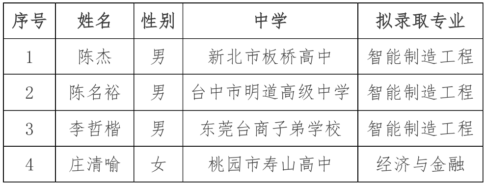 根据教育部有关文件和《太阳城娱乐城2020年依据台湾地区大学入学考试学科能力测试成绩招收台湾地区高中毕业生招生简章》等文件精神,经过报名审核、评委面试,现将拟录取名单和拟录取专业予以公示,公示期为2020年6月8日- 6月26日。对成绩有疑问者,请于公示期内提出,过期不再受理。