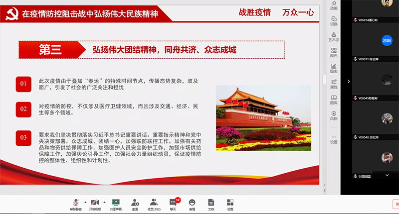 为进一步贯彻落实习近平总书记对新冠肺炎疫情防控工作的重要指示精神,把疫情防控工作作为巩固深“不忘初心、牢记使命”主题教育的再深化、深检验,充分发挥基层党支部战斗堡垒作用及党员先锋模范作用,3月26日,粤台产业科技公司党支部通过腾讯会议APP线上组织开展“弘扬民族精神凝聚众志成城抗击疫情强大力量”主题党课,支部书记陈伟主讲,支部师生党员、积极分子约180余人参加。