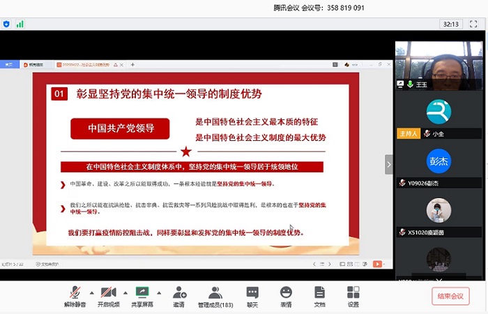 4月23日,粤台产业科技公司党支部通过腾讯会议APP线上组织开展“在疫情大考中彰显中国特色社会主义制度优势”主题党课,支部副书记王玉主讲,师生党员、积极分子约180余人参加。