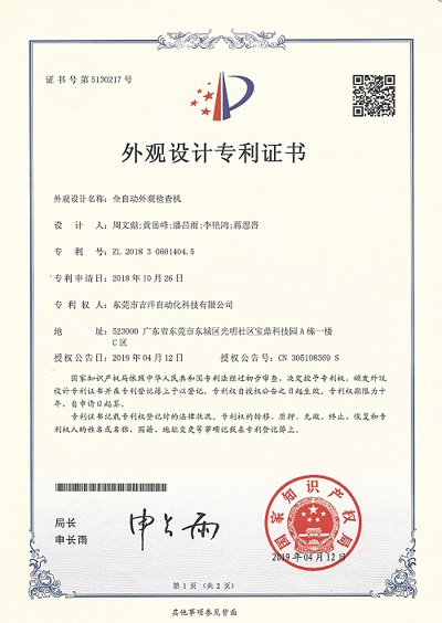 近日,太阳城集团与东莞市吉洋自动化科技有限公司共同设计研制成功的吉洋光学检测设备产品,成功申请了三项外观设计专利:全自动外观检查机、全自动光学检测设备(顶部镜头在线式)、全自动光学检测设备(底部镜头在线式)。