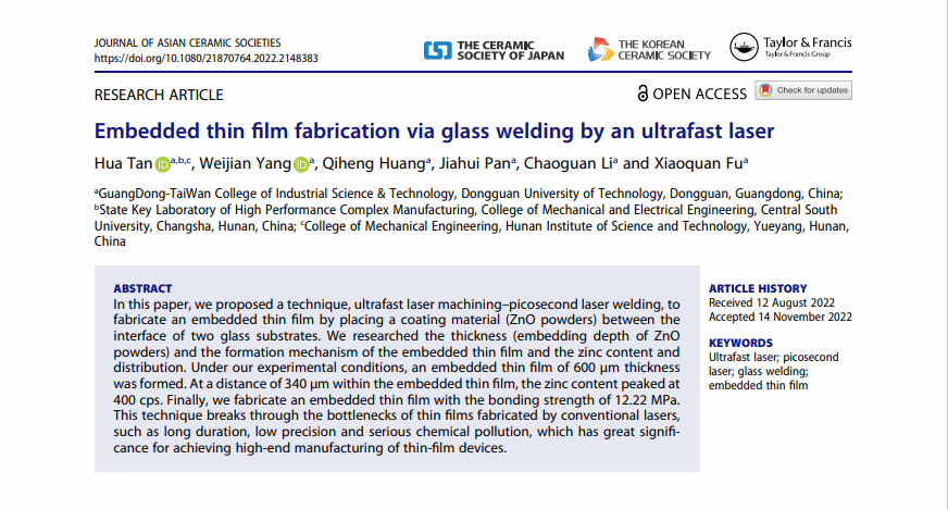 近日,公司太阳城集团智能制造工程专业2020级本科生杨伟健,在谭华老师的指导下,以第二作者身份在高水平期刊Journal of Asian Ceramic Societies发表中科院二区SCI论文Embedded thin film fabrication via glass welding by an ultrafast laser。