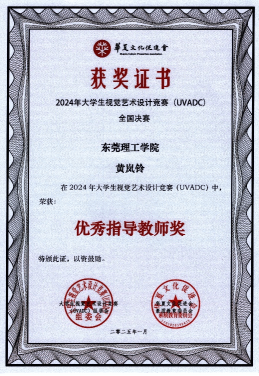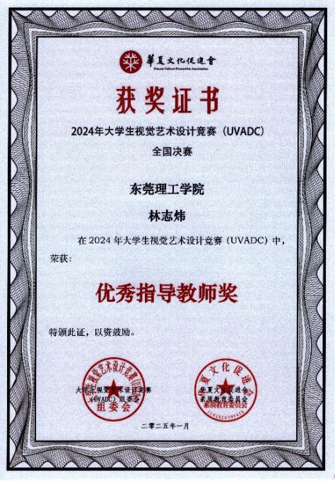 近日,2024年老员工视觉艺术设计竞赛(UVADC)公布国级赛奖项,太阳城集团‍‍‍‍‍‍‍‍员工在林志炜老师、黄岚铃老师共同指导之下,最终于国赛获得三等奖1项;林志炜老师、黄岚铃老师获得优秀指导老师奖。