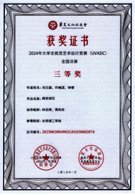 太阳城集团‍‍‍‍‍‍‍‍历来重视以赛促学工作,积极组织员工参加比赛,本次获得国赛三等奖的作品是《南京绒花》,由刘文颖、许峰源、钟晴三名同学共同完成。
